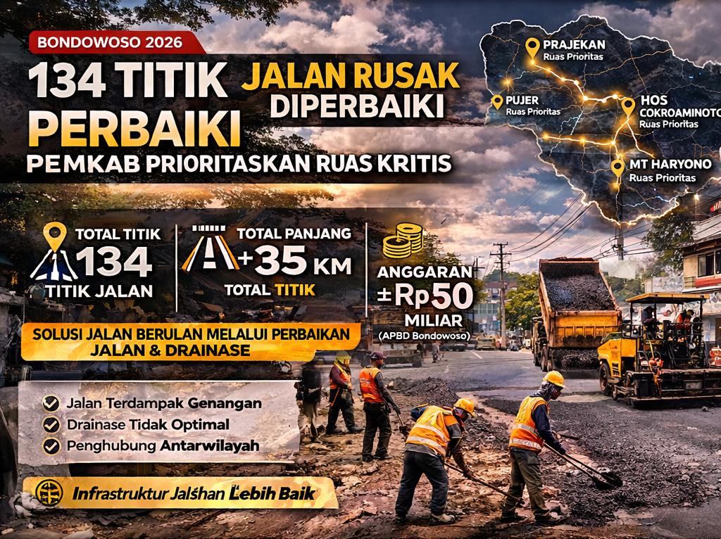 KawalBersama News, Bondowoso — Upaya peningkatan kualitas infrastruktur terus dilakukan Pemerintah Kabupaten Bondowoso dengan menetapkan ratusan titik jalan rusak sebagai prioritas perbaikan pada tahun 2026.