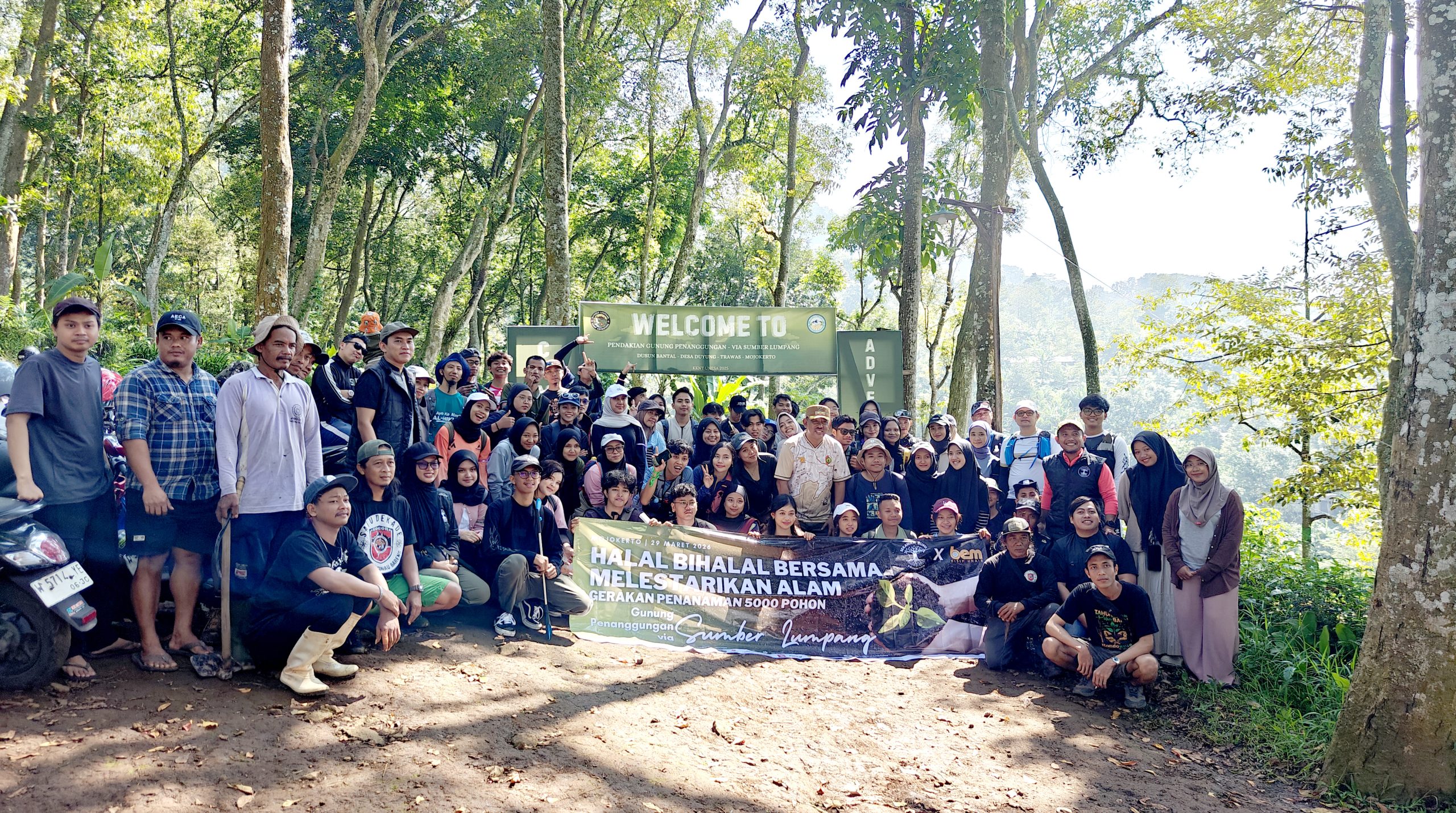 Momen kebersamaan relawan dalam acara 'Halal Bihalal Bersama Melestarikan Alam' sekaligus Gerakan Penanaman 5000 Pohon di kawasan Sumber Lumpang, Gunung Penanggungan.